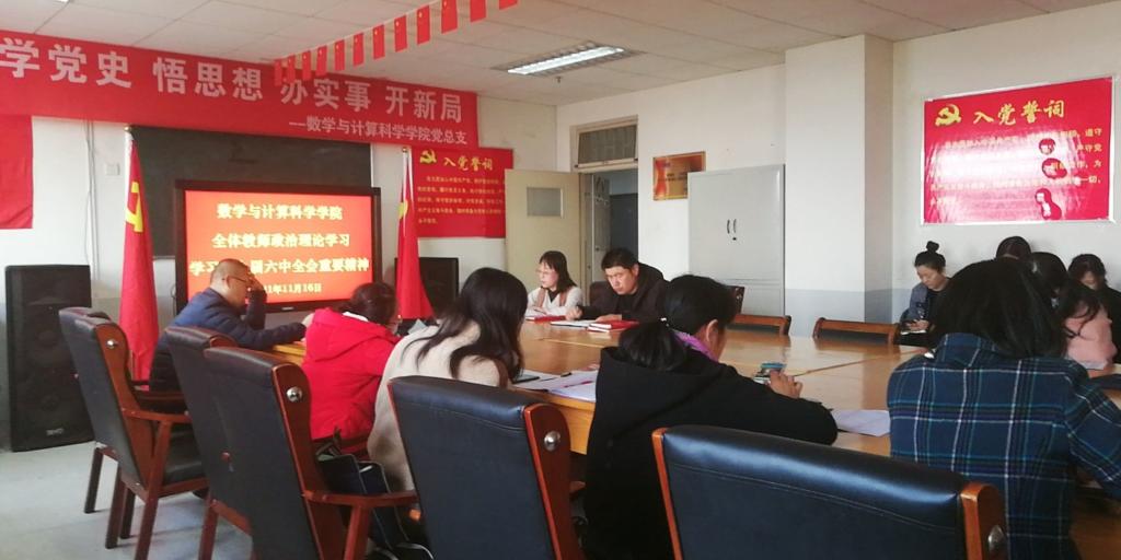 在庆祝中国共产党百年华诞的热烈氛围中,在“两个一百年”奋斗目标的历史交汇期,中国共产党第十九届中央委员会第六次全体会议于2021年11月8日至11日在北京隆重举行。为认真学习贯彻习近平总书记在党的十九届六中全会上的重要讲话精神和全会精神,11月16日下午14:30,数学与计算科学公司党总支在主楼十一层会议室召开学习贯彻党的十九届六中全会精神全体教师会,会议由党总支书记檀艳主持。