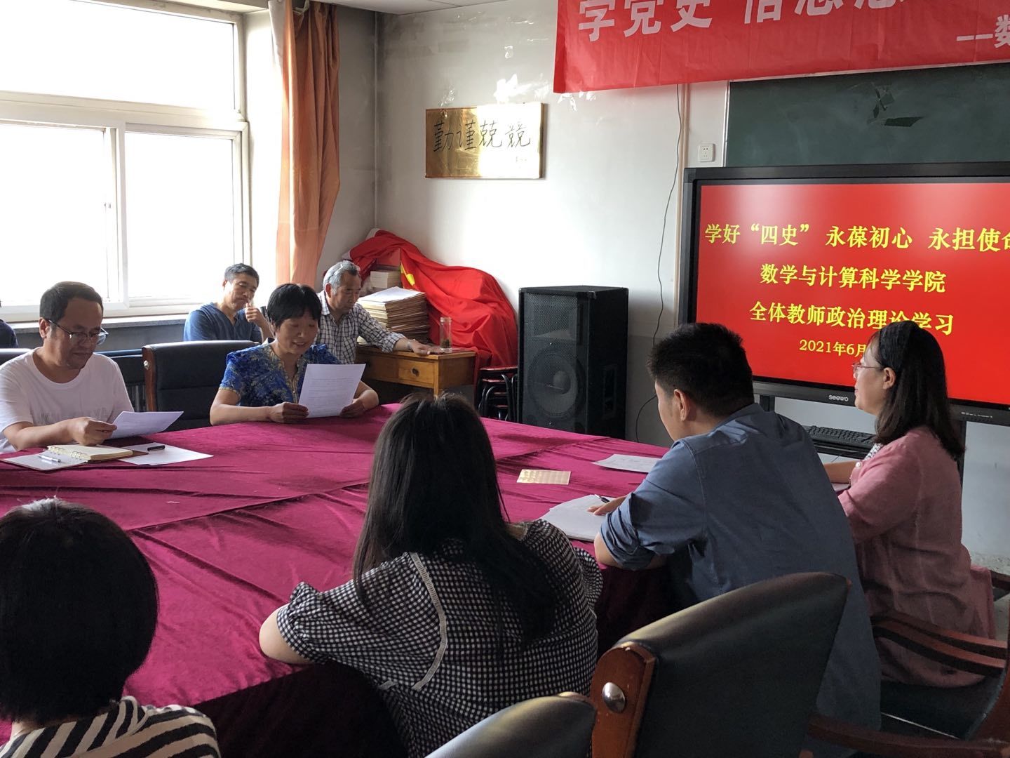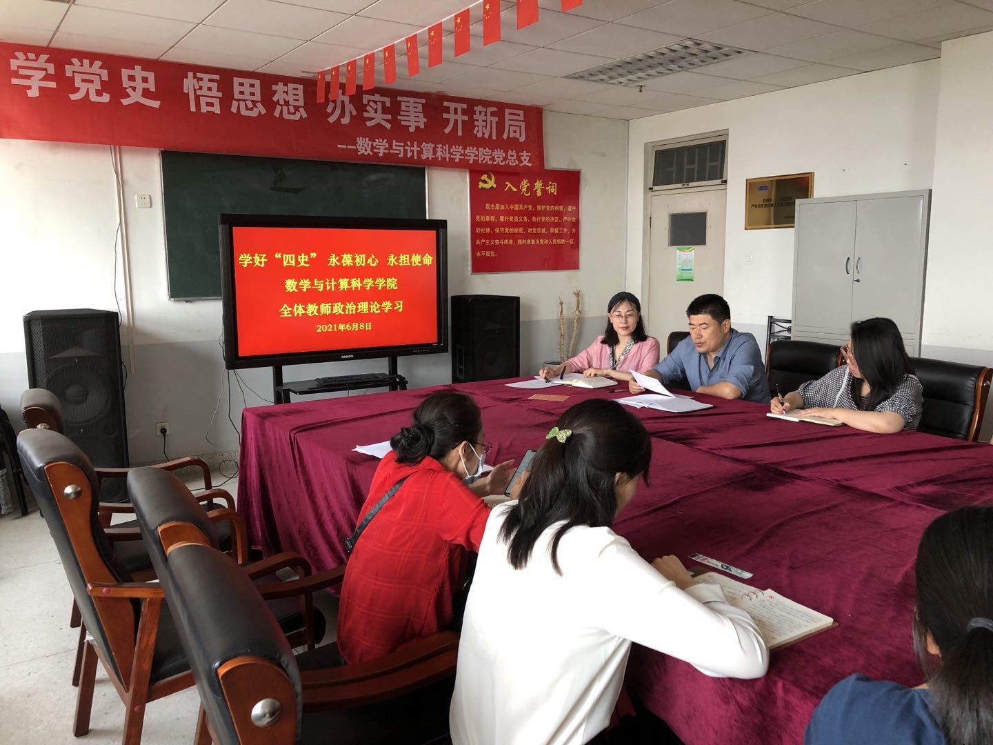 6月8日下午,k1体育组织全体教师围绕习近平总书记关于“四史”的重要论述进行集体学习研讨,深入学习习近平总书记的重要文章《学好“四史”,永葆初心、永担使命》,会议由数学与计算科学公司党总支书记檀艳主持。