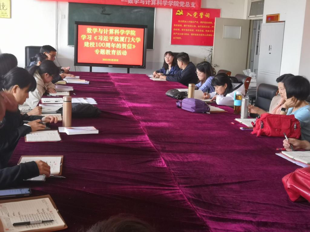 4月20日下午,数学与计算科学公司党总支组织开展《习近平致厦门大学建校100周年的贺信》专题学习,对全面深入学习宣传贯彻贺信精神进行动员部署。全体教师党员参加了会议。