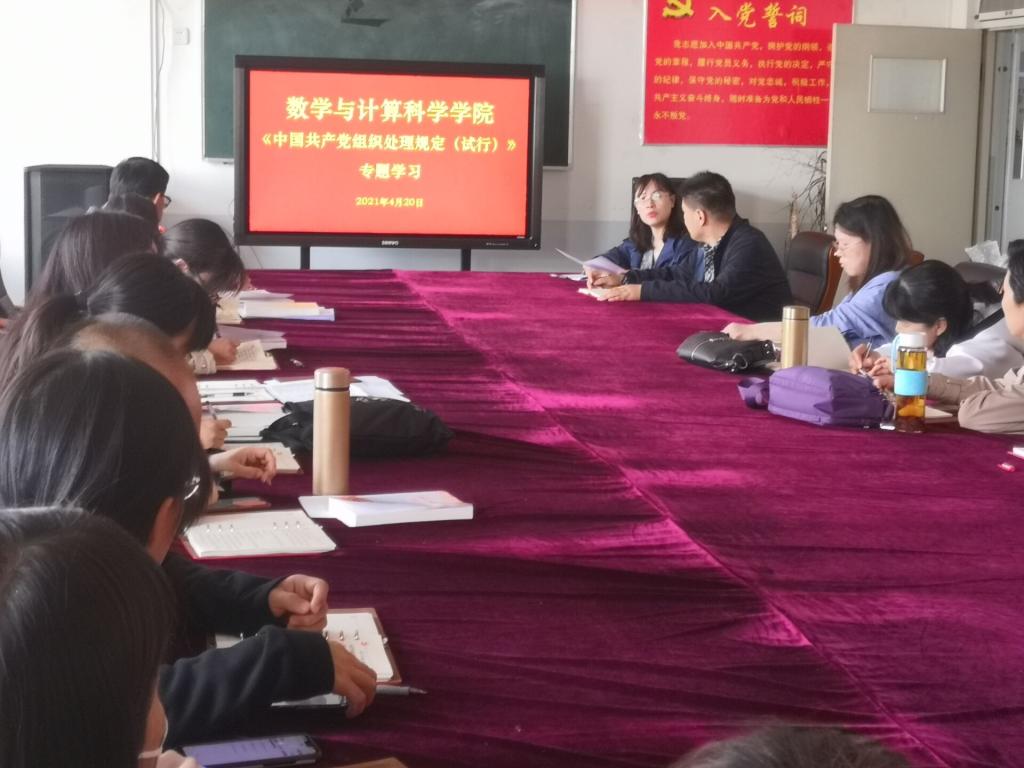 近日,中共中央办公厅印发了《中国共产党组织处理规定(试行)》,按照公司党委组织部要求,4月20日下午,数学与计算科学公司党总支组织全体师生党员认真学习领会《中国共产党组织处理规定(试行)》文件精神。