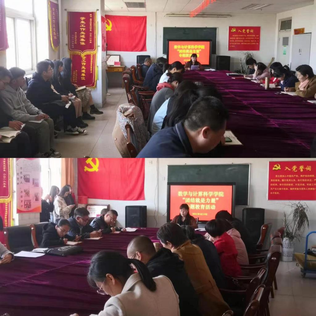为深入贯彻落实习近平总书记在党史学习教育动员大会上的重要讲话精神和省、市委、公司党委围绕认真学习贯彻习近平总书记重要回信精神作出的重要部署,数学与计算科学公司党总支于4月13日下午组织开展了以“万众一心,心手相连,以团结之伟力铸公司辉煌”为主题的“团结就是力量”专题学习,全体师生党员参加了会议。