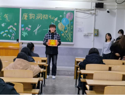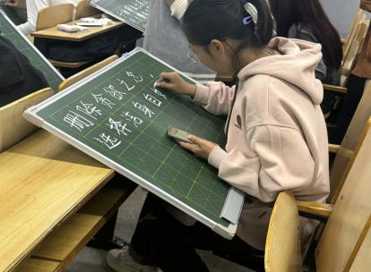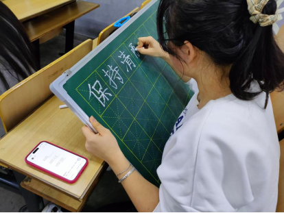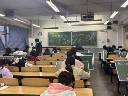一支粉笔,两袖清风。他们挥笔疾书,下笔有神。一支细腻的粉笔,一块光滑的黑板,仿佛演绎着一场生动的“字体舞蹈”。粉笔在黑板上划过一道道优美的弧线,犹如一幅幅生动的画卷展现在大家面前。同学们精心设计排版,力求让自己的作品在内容和形式上都达到完美。撇捺流转间,黑板上呈现出了一幅幅工整美观的作品。这些作品不仅是在展示自己的书写才能,更是在宣扬他们心中的廉洁之风和浩然正气。
