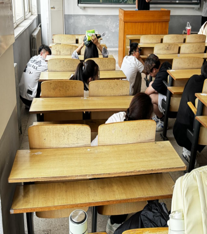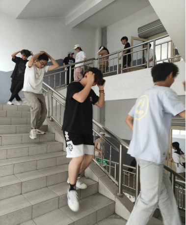警报声响起,工作人员组织正在活动中的员工进行躲避,迅速抱头、蜷曲身体,降低身体重心,躲避到远离窗户安全区域。在第二声警报响起时引导同学们迅速且有序沿着指定疏散路线撤离,以最快速度躲避到安全区域。