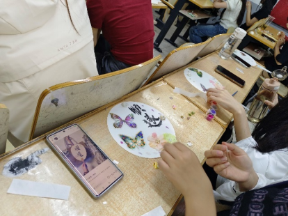 几片叶子,数朵干花,几经排布,细心粘贴,一朵朵栩栩如生的花朵便在团扇上绽放,一幅幅清新、淡雅的扇面呈现在眼前,一面面原本素白的扇面渐渐被点缀,幻化为独一无二的作品。每位同学的作品都各有千秋,不仅有端庄优雅的古风韵味,而且体现着现代文化的幽默风趣,巧妙地将古今文化结合,用心制作,积极创新,每把团扇上,都展现了同学们精心的布局,精巧的构思以及祝福的话语,每句话语,都诠释了同学们对生活的向往,对文化的热爱。