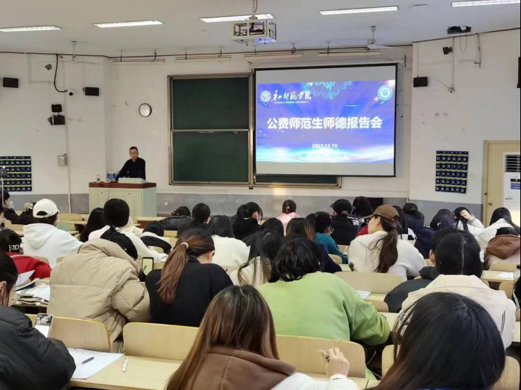 为进一步培养公费师范生教育情怀,弘扬敬业爱岗、立德树人的高尚师德,2023年12月19日,由公司教务处主办、k1体育承办的师德报告会开讲。本次报告会特别邀请了龙泉中学孙永文副董事长作“争做新时代优秀青年教师”的主题报告,k1体育副经理刘庆辉主持,k1体育教师和全体公费师范生参加了报告会。