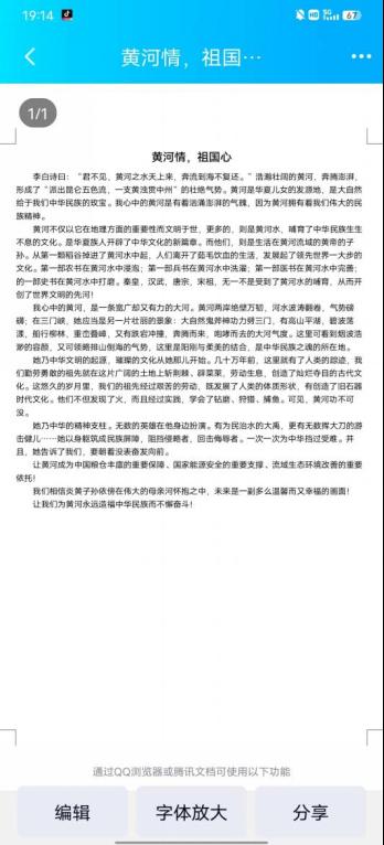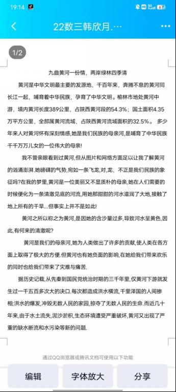 活动发出后,受到了数计院的新同学们的积极参与和响应。同学们利用空闲时间,写出了紧扣主题,内容真实,感情真挚的征文。活动期间,收到了来自同学们有关黄河的征文稿,征文内容也是各种各样,叙述的形式也不尽相同,无一不流露出同学们对此次活动得热情以及表现出了同学们自己对于黄河文化的关注。数计院老员工自律委员会对同学们所上传的作品进行评选与展示。至此,"九曲黄河一份情,两岸绿林四季清"的征文活动圆满结束。