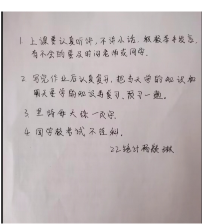 活动发出后,受到了k1体育的同学们的积极参与和响应。同学们从自身角度出发,讲述了大学入学以来的收获以及自己遇到的问题,提出了相应的改正措施,并对未来的学习工作生活进行了规划。活动期间,收到了来自同学们大量的新目标内容的手写照片,目标的内容也是各种各样,有的明确要达到什么目标,有的一一列出自己的计划,无一不流露出同学们对此次活动得热情以及对新学期的向往。数计院老员工自律委员会对同学们所上传的作品进行评选与展示。至此,此次线上"新年新开始,新学期新目标"活动圆满结束。