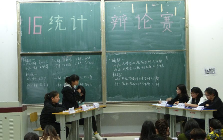 2017年3月19日19点整,16级统计学班级在公司六阶梯教室举行了友谊辩论赛。此次辩论赛邀请到我系系员工会主席担任评委。由统计学同学组成的正反方辩手通过辩题“老员工在校创业是否利大于弊”和“宽松管理老员工是否利大于弊”共两个辩题展开激烈辩论。